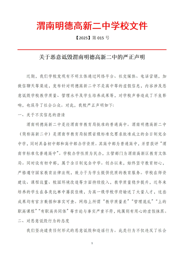 关于恶意诋毁渭南明德高新二中严正声明